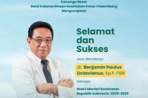 Keluarga Besar Balai Kekarantinaan Kesehatan Kelas I Palembang mengucapkan selamat dan sukses kepada dr. Benjamin Paulus Octavianus, Sp.P, FISR atas pelantikan sebagai Wakil Menteri Kesehatan Republik Indonesia. Dengan harapan, Bapak senantiasa diberikan kekuatan dan kebijaksanaan dalam menjalankan tugas, serta terus menghadirkan inovasi dan kemajuan bagi kesehatan masyarakat Indonesia. #bkkpalembang #PACAK…