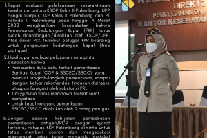 Selamat Pagi Sahabat Kespel, Dalam Apel Pagi yang dilaksanakan pada hari Senin tanggal 14 Maret 2022, terdapat beberapa arahan yang diberikan oleh Kepala Kantor Kesehatan Pelabuhan Kelas II Palembang, Ibu Emmilya Rosa, SKM, MKM sebagai berikut : Berdasarkan kesepatan rapat evaluasi pelaksanaan kekarantinaan kesehatan, antara KSOP Kelas II Palembang,…