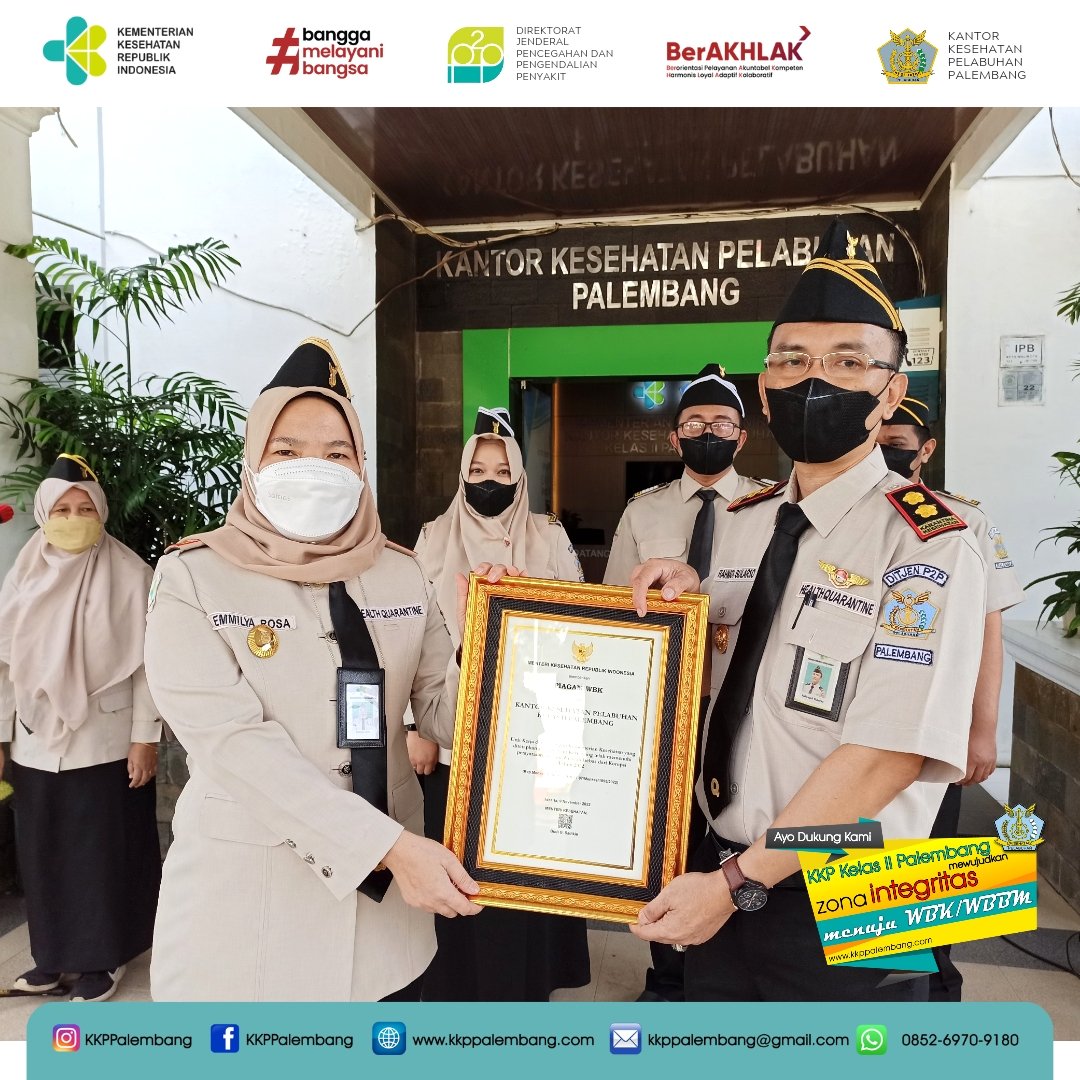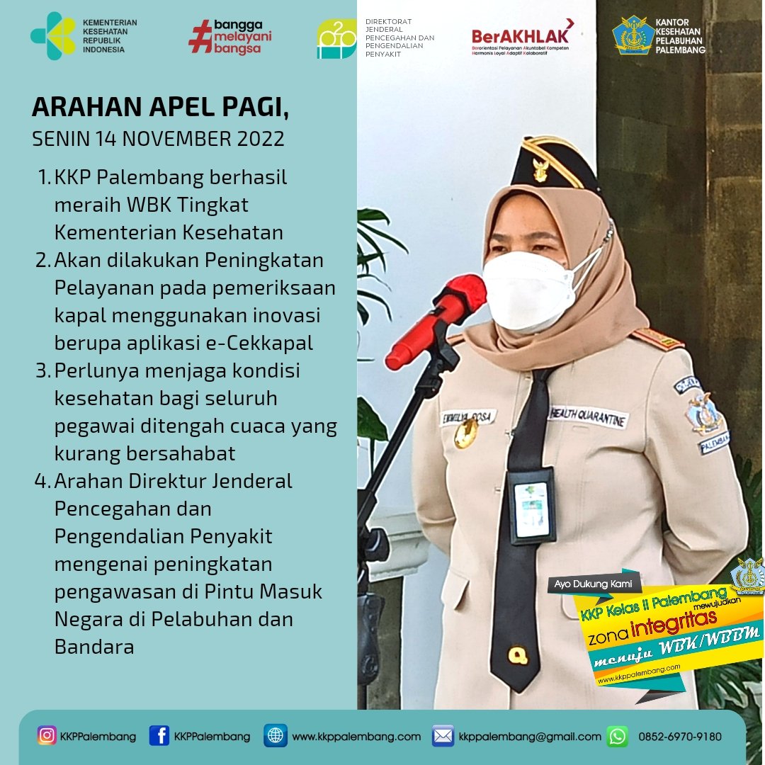 Pada apel Pagi ini Senin 14 November 2022, Ibu Emmilya Rosa, SKM MKM selaku kepala Kantor Kesehaatan Pelabuhan Kelas II Palembang menyampaikan apresiasi atas keberhasilan KKP Kelas II Palembang meraih Wilayah Bebas dari Korupsi Tingkat Kementerian Kesehatan, selain itu juga teradapat beberapa arahan tambahan dalam pelaksanaan kegiatan, antara lain :