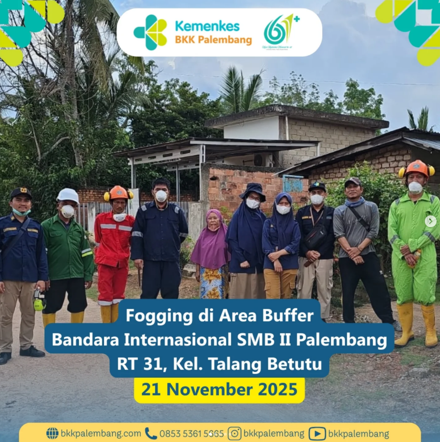Jumat, 21 November 2025, Tim Kerja 3 Pengawasan Faktor Risiko Kesehatan Lingkungan melaksanakan kegiatan fogging di Area Buffer Bandara Internasional SMB II Palembang, tepatnya di RT 31, Kelurahan Talang Betutu.
