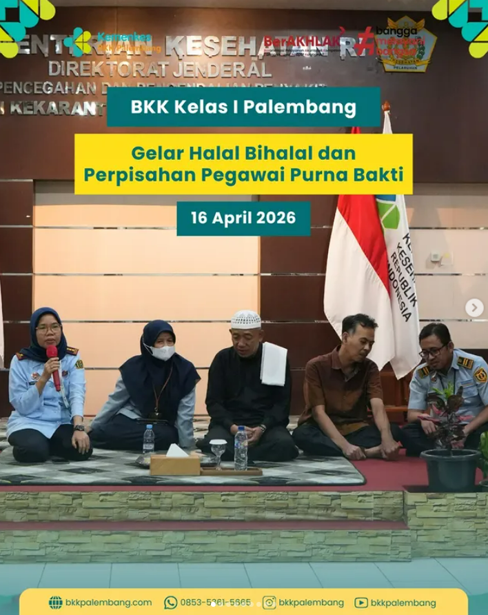 Kamis, 16 April 2026, BKK Kelas I Palembang melaksanakan kegiatan Halal Bihalal, Perpisahan Pegawai Purna Bakti, serta Doa Selamat bagi Pegawai yang akan Berangkat Haji di Aula Kantor Induk BKK Kelas I Palembang. Kegiatan ini diikuti oleh seluruh pegawai ASN dan tenaga outsourcing.