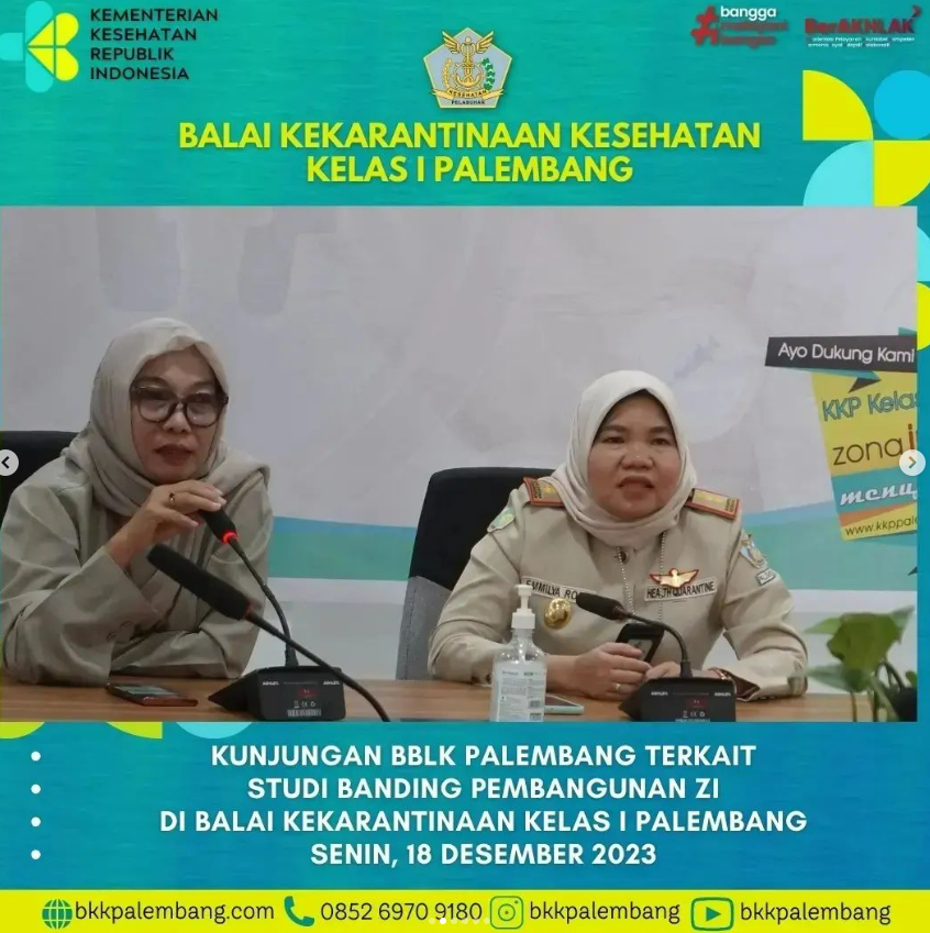 Pada hari Senin, 18 Desember 2023, Kepala Balai Kekarantinaan Kesehatan Kelas I Palembang Ibu Emmilya Rosa, SKM, MKM menerima kunjungan dari dr. Lisa Dewi, M. Kes selaku Koordinator Pelayanan sekaligus Ketua Tim ZI BBLK Palembang terkait Studi Banding Kaji Tiru atas Pembangunan ZI yang telah dilakukan oleh BKK Kelas I Palembang.