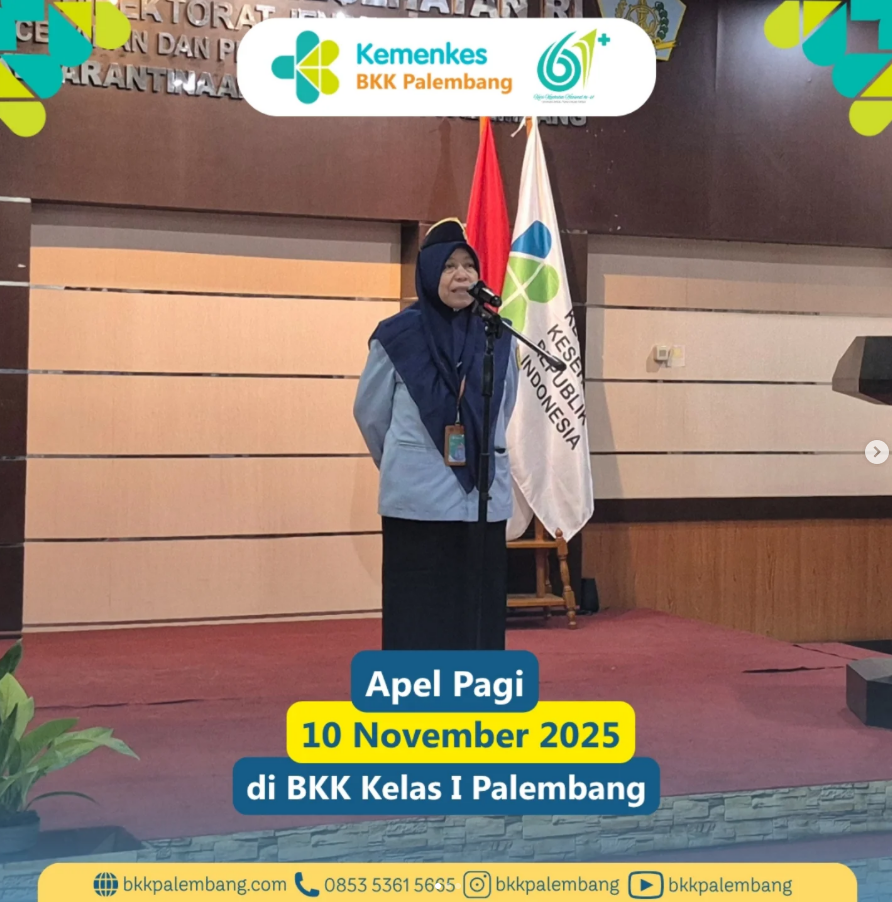 Senin, 10 November 2025, BKK Kelas I Palembang melaksanakan apel pagi rutin di Aula Kantor Induk BKK Palembang. Kegiatan ini dipimpin oleh Ketua Tim Kerja 4 Pengawasan Faktor Risiko Kesehatan Orang, Kegawatdaruratan, dan Situasi Khusus, dr. Fenty Wardha, M.Kes., serta diikuti oleh seluruh pegawai ASN dan tenaga outsourcing.