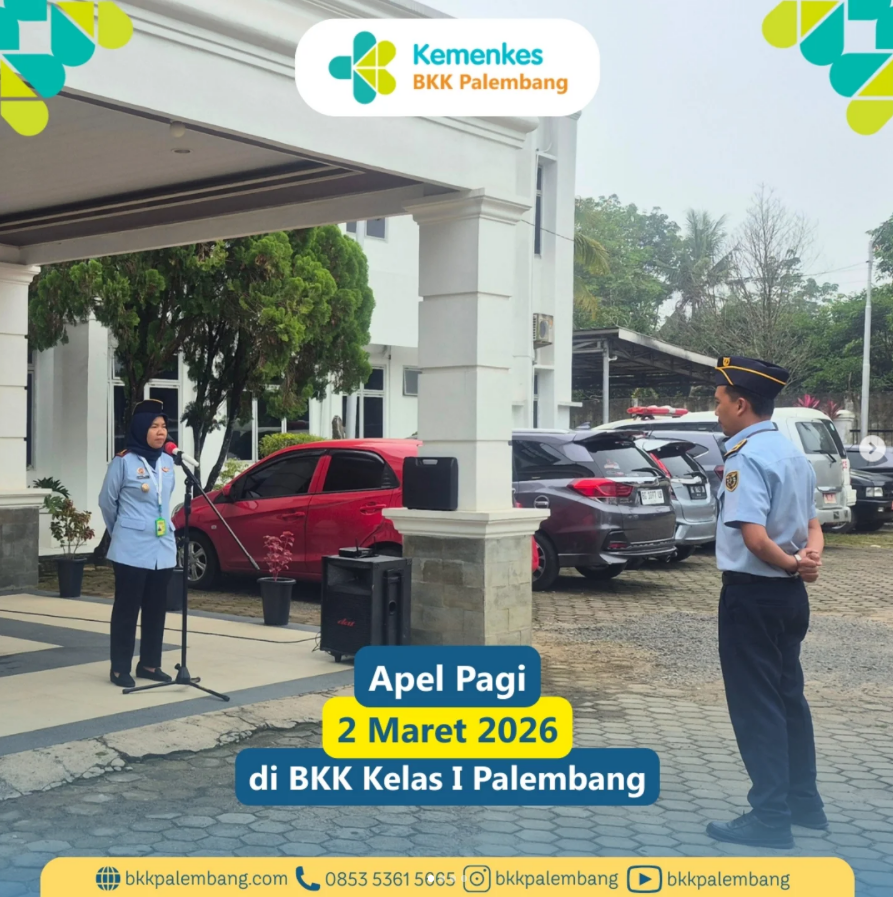 Senin, 2 Maret 2026, BKK Kelas I Palembang melaksanakan apel pagi rutin yang dipimpin oleh Ibu Emmilya Rosa, SKM, MKM, selaku Kepala BKK Kelas I Palembang. Apel pagi dilaksanakan di halaman kantor induk BKK Kelas I Palembang dan diikuti oleh seluruh pegawai ASN serta tenaga outsourcing.