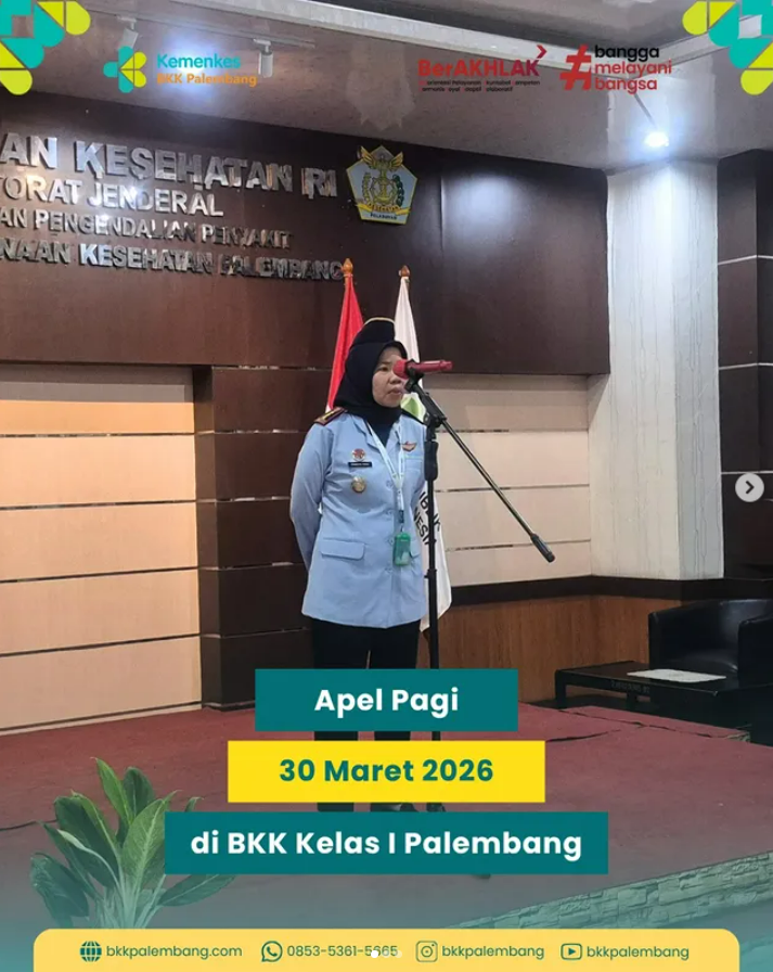 Senin, 30 Maret 2026, BKK Kelas I Palembang melaksanakan apel pagi rutin yang dipimpin oleh Kepala BKK Kelas I Palembang, Ibu Emmilya Rosa, SKM, MKM. Kegiatan ini berlangsung di Aula BKK Kelas I Palembang dan diikuti oleh seluruh pegawai ASN serta tenaga outsourcing.