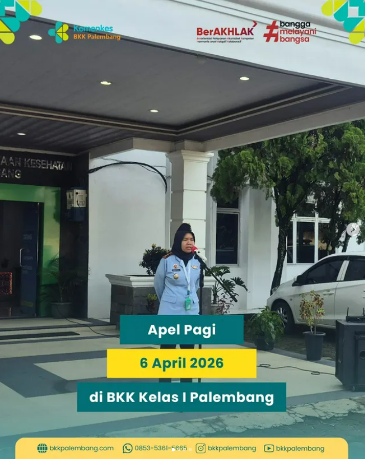 Senin, 6 April 2026, BKK Kelas I Palembang melaksanakan apel pagi rutin yang dipimpin langsung oleh Kepala BKK Kelas I Palembang, Ibu Emmilya Rosa, SKM, MKM. Kegiatan ini berlangsung di halaman kantor induk dan diikuti oleh seluruh pegawai ASN serta tenaga outsourcing di lingkungan BKK Kelas I Palembang.