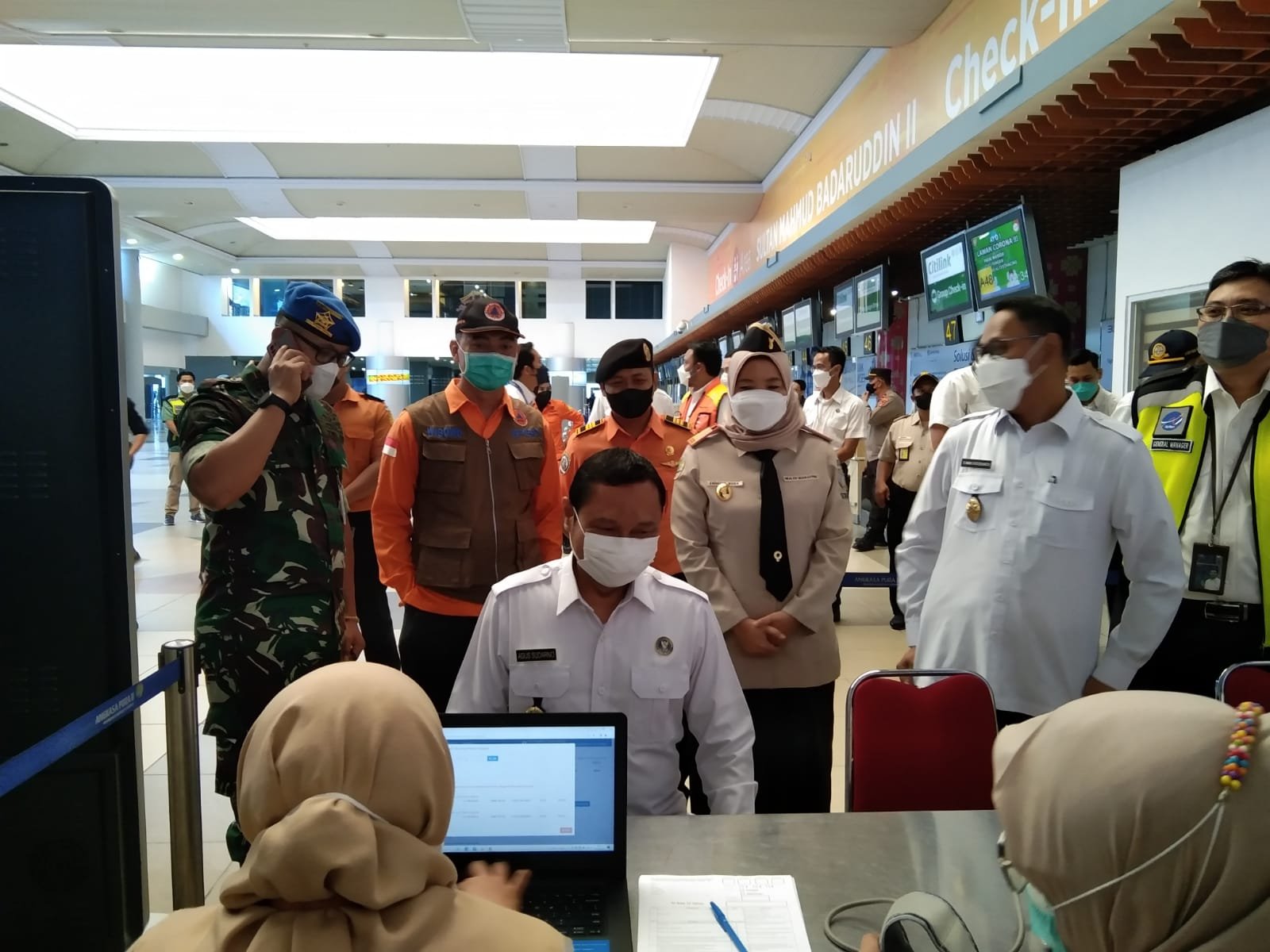 Bapak Kombes Agus, yang belum mendapatkan vaksinasi Booster, berkesempatan menjadi orang pertama yang divaksin, sekaligus melihat bagaimana pelayanan vaksinasi booster akan berjalan selama arus mudik di Bandara SMB II.