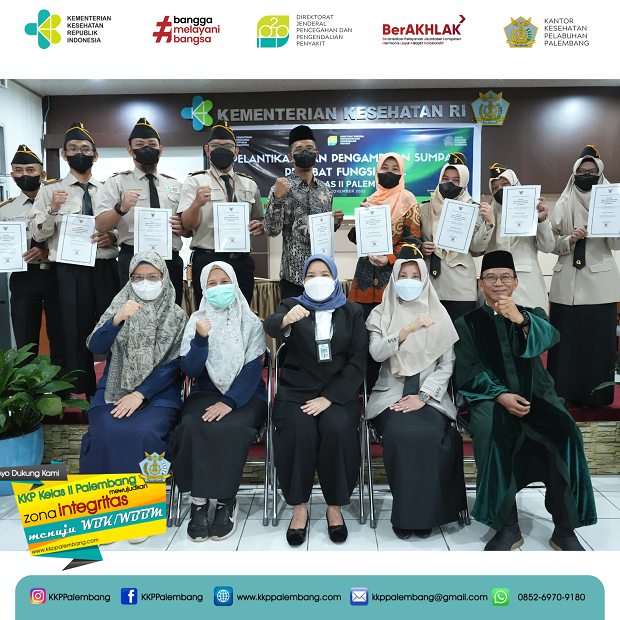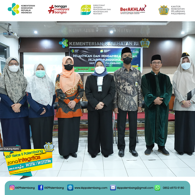 Kepala Kantor Kesehatan Pelabuhan Palembang, Ibu Emmilya Rosa,SKM, MKM Melantik dan mengambil sumpah jabatan fungsional Epidemiolog Kesehatan Ahli Muda terhadap 2 orang pegawai KKP Palembang a.n Bpk. Maraden Sirait, SKM, MKM. dan Ibu Novatria, SKM, MKM.