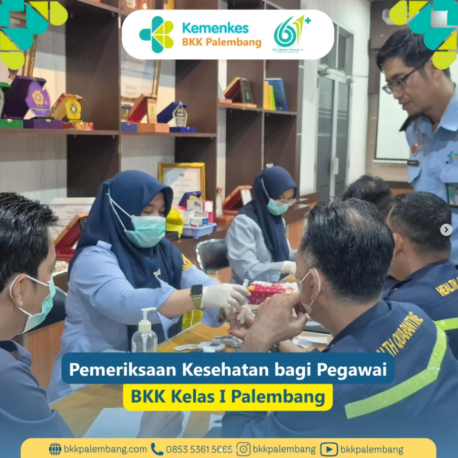 Kamis, 6 November 2025, seluruh pegawai Balai Kekarantinaan Kesehatan Kelas I Palembang telah melaksanakan pemeriksaan kesehatan dalam rangka Pengukuran Kebugaran Triwulan IV di Kantor Induk BKK Kelas I Palembang.