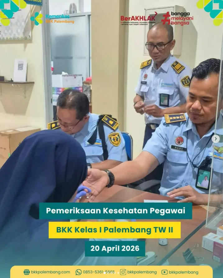 Senin, 20 April 2026, pegawai BKK Kelas I Palembang melaksanakan pemeriksaan kesehatan dalam rangka Pengukuran Kebugaran Triwulan II yang bertempat di Kantor Induk BKK Kelas I Palembang.