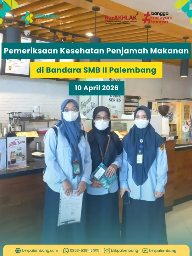 Jumat, 10 April 2026, BKK Kelas I Palembang melaksanakan kegiatan pemeriksaan kesehatan berupa rectal swab kepada penjamah makanan di Bandara Internasional SMB II Palembang.