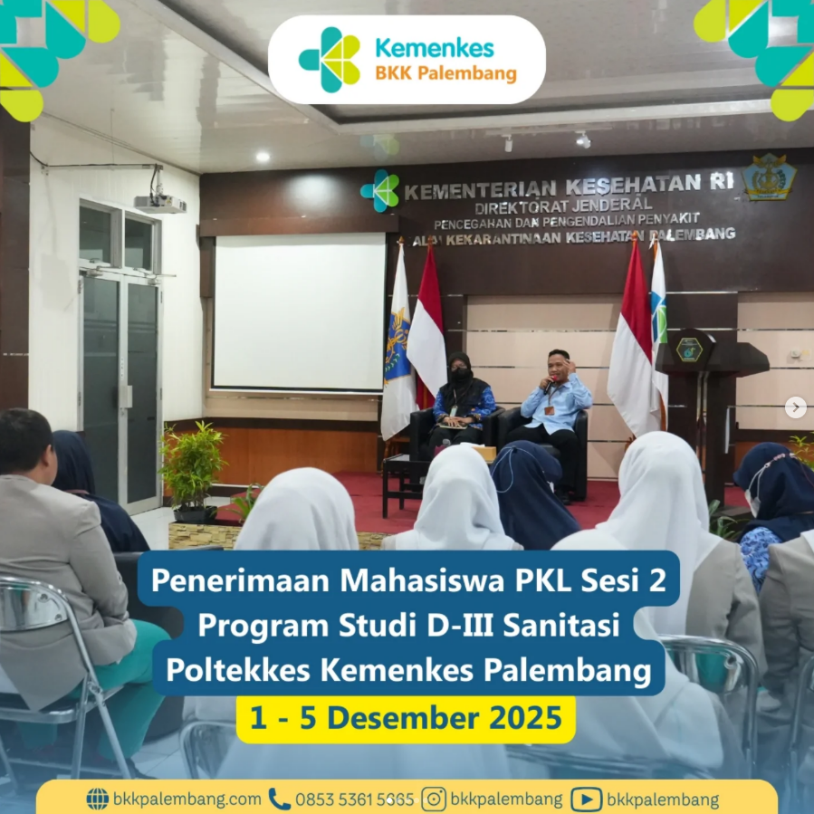 Senin, 1 Desember 2025, BKK Kelas I Palembang menerima 20 mahasiswa Praktik Kerja Lapangan (PKL) Sesi 2 dari Program Studi D-III Sanitasi, Jurusan Kesehatan Lingkungan, Poltekkes Kemenkes Palembang.
