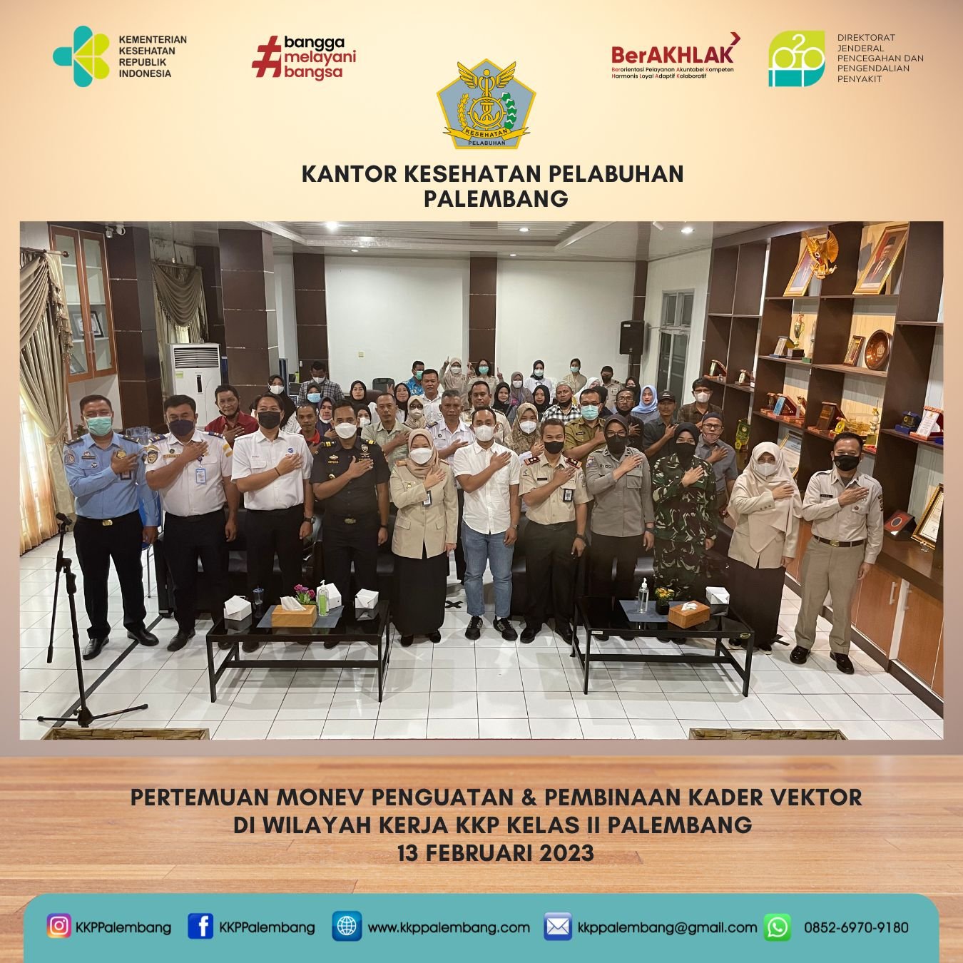 Senin, 13 Februari 2023 KKP Kelas II Palembang melalui Substansi Pengendalian Risiko Lingkungan (PRL) mengadakan kegiatan Pertemuan Monev Penguatan & Pembinaan Kader Vektor di Wilayah kerja KKP kelas II Palembang. Kegiatan ini dihadiri para stakeholder yang berada di wilayah kerja Pelabuhan dan Bandara beserta para kader yang berada di wilayah kerja KKP kelas II Palembang.