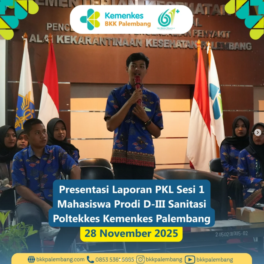 Jumat, 28 November 2025, sebanyak 30 mahasiswa Prodi D-III Sanitasi Poltekkes Kemenkes Palembang melaksanakan Presentasi Laporan Praktik Kerja Lapangan (PKL) di Aula BKK Kelas I Palembang.