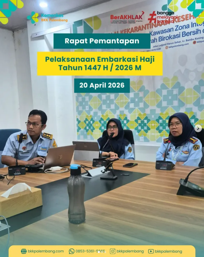 Senin, 20 April 2026, BKK Kelas I Palembang melaksanakan Rapat Pemantapan Pelaksanaan Embarkasi Haji Tahun 2026 di ruang rapat Kantor Induk.