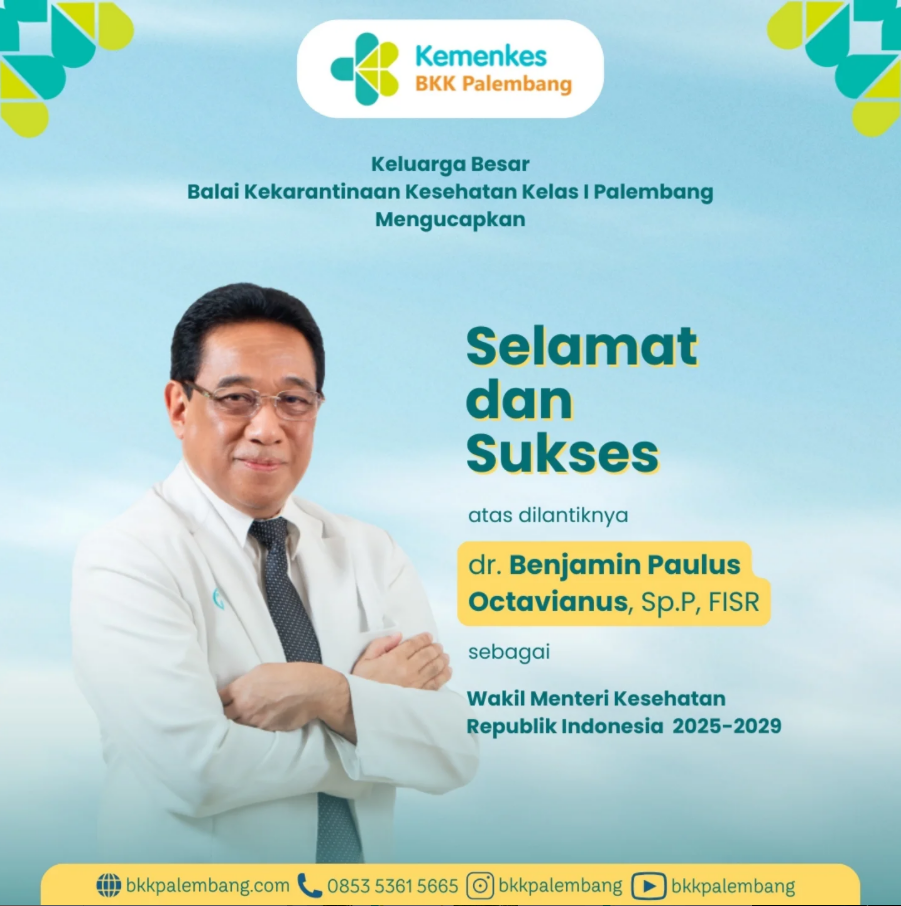 Keluarga Besar Balai Kekarantinaan Kesehatan Kelas I Palembang mengucapkan selamat dan sukses kepada dr. Benjamin Paulus Octavianus, Sp.P, FISR atas pelantikan sebagai Wakil Menteri Kesehatan Republik Indonesia.