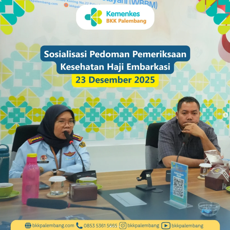Selasa, 23 Desember 2025, BKK Kelas I Palembang menerima kunjungan Tim Pusat Kesehatan Haji Kementerian Haji dan Umrah RI, yaitu dr. Tri Atmaja (Ketua Tim Sistem Informasi), dr. Agus Sultoni, MMRS, dr. Anin Ika Rosa, M.Gz, dan Ibu Febriani, SKM, M.Si, dalam rangka pelaksanaan Sosialisasi Pedoman Pemeriksaan Kesehatan Haji Embarkasi.
