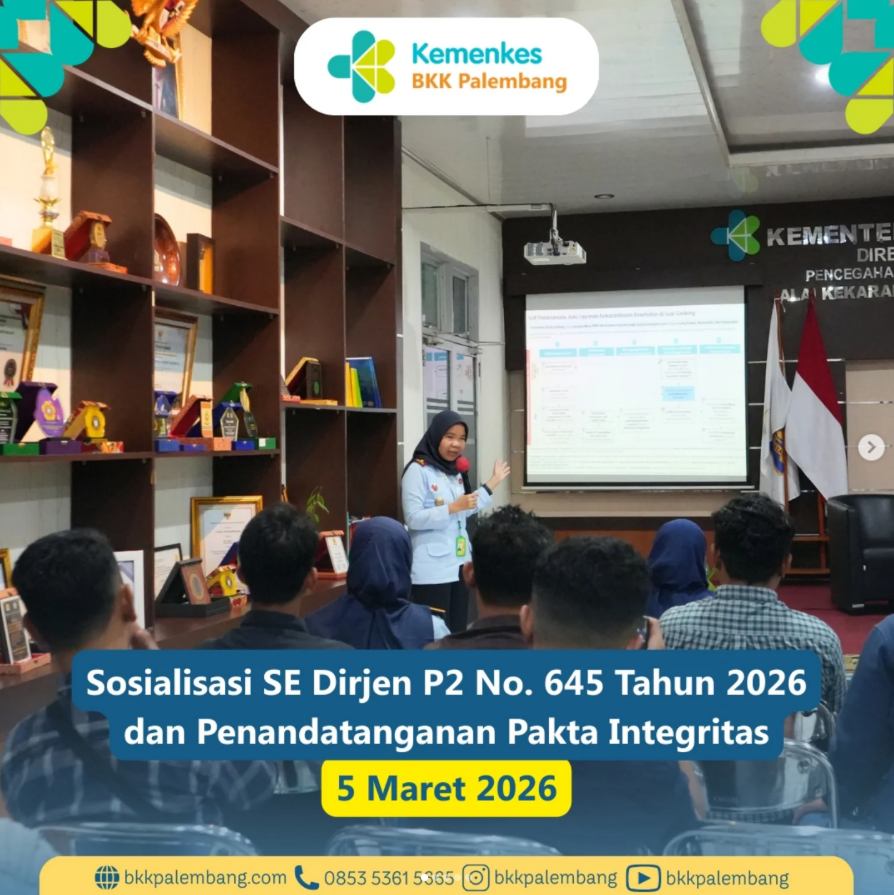Kamis, 5 Maret 2026, telah dilaksanakan kegiatan Sosialisasi Surat Edaran Dirjen P2 Nomor 645 Tahun 2026 tentang Implementasi Kepmenkes Nomor 898 Tahun 2025 serta Penandatanganan Pakta Integritas. Kegiatan ini dilaksanakan di Aula BKK Kelas I Palembang dan diikuti oleh agen pelayaran wilayah Sumatera Selatan.
