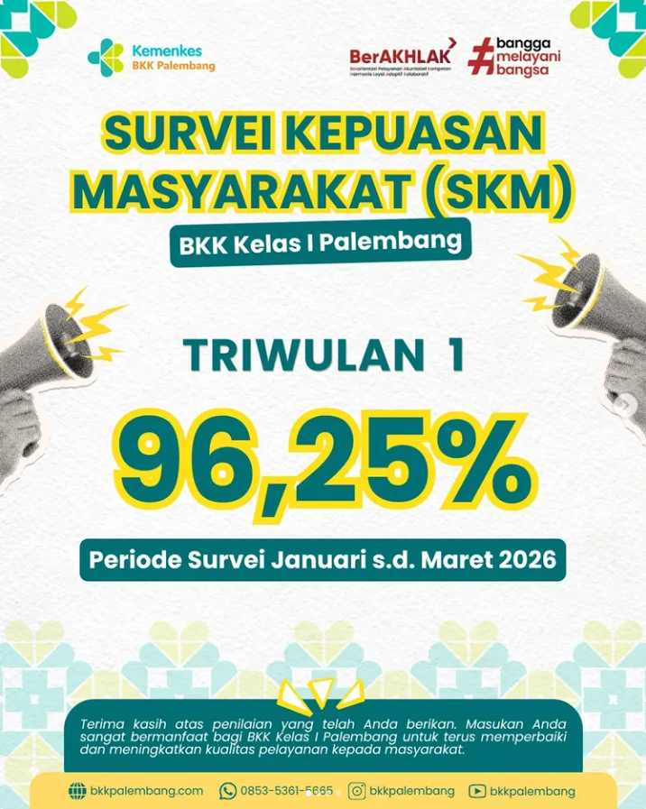 Dalam rangka mewujudkan pelayanan publik yang prima, transparan, dan berorientasi pada kepuasan masyarakat, BKK Kelas I Palembang secara berkala melaksanakan survei untuk mengukur persepsi serta tingkat kepuasan pengguna layanan.