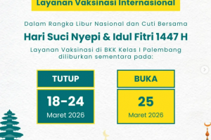 Sobat Karkes, Sehubungan dengan Libur Nasional dan Cuti Bersama Hari Suci Nyepi serta Idul Fitri 1447 H, kami informasikan bahwa terdapat penyesuaian layanan Vaksinasi Internasional di BKK Kelas I Palembang. Bagi masyarakat yang akan melakukan vaksinasi untuk keperluan umrah maupun perjalanan internasional, diharapkan dapat menyesuaikan jadwal pelayanan sesuai dengan pengumuman…