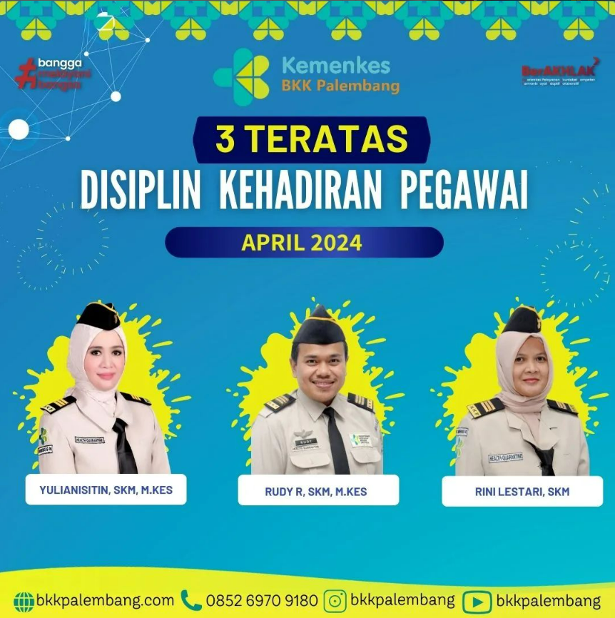 Sebagai bentuk apresiasi kepada pegawai yang telah menunjukkan kinerja kedisiplinan yang baik, Balai Kekarantinaan Kesehatan Kelas I Palembang setiap bulan akan menampilkan 3 (tiga) foto pegawai terbaik dan foto tersebut dipasang di ruangan kantor serta diposting melalui media sosial.