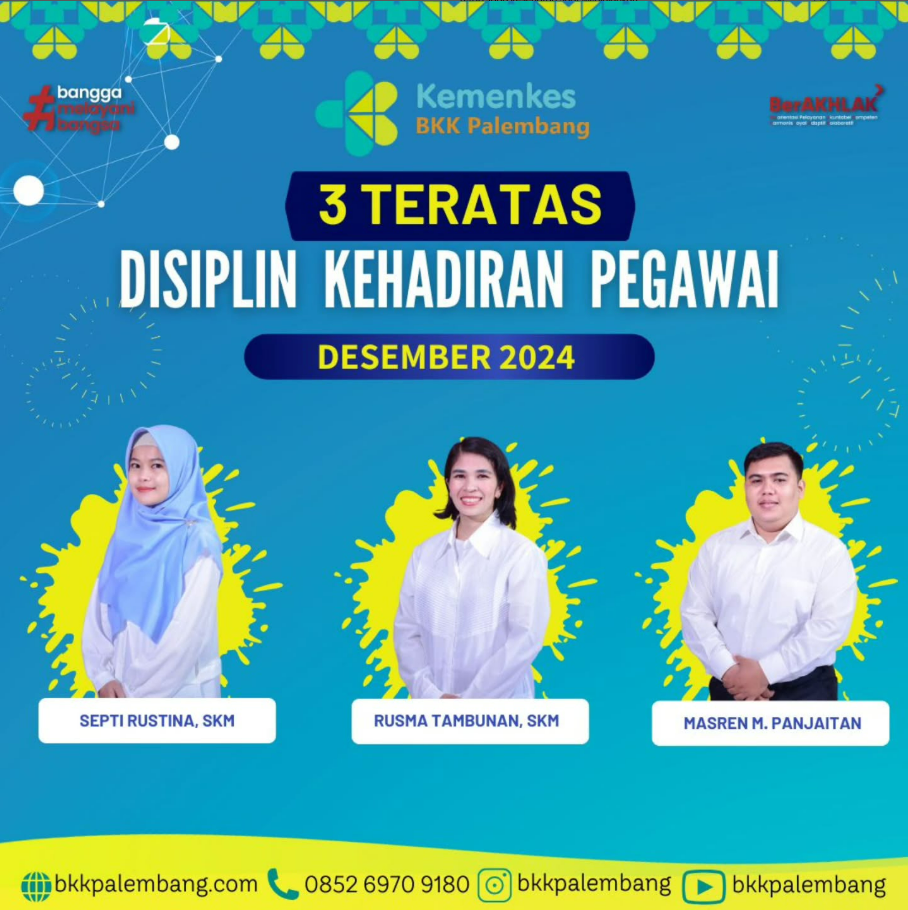 Sebagai bentuk apresiasi kepada pegawai yang telah menunjukkan kinerja kedisiplinan yang baik, Balai Kekarantinaan Kesehatan Kelas I Palembang setiap bulan akan menampilkan 3 (tiga) foto pegawai terbaik dan foto tersebut dipasang di ruangan kantor serta diposting melalui media sosial.
