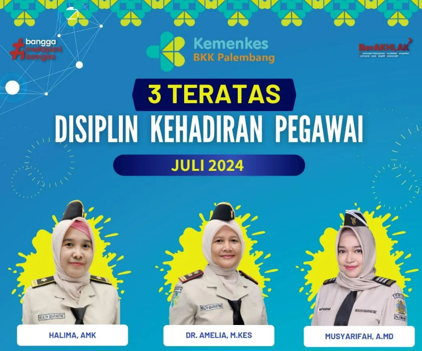 Sebagai bentuk apresiasi kepada pegawai yang telah menunjukkan kinerja kedisiplinan yang baik, Balai Kekarantinaan Kesehatan Kelas I Palembang setiap bulan akan menampilkan 3 (tiga) foto pegawai terbaik dan foto tersebut dipasang di ruangan kantor serta diposting melalui media sosial.