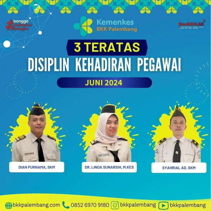 Sebagai bentuk apresiasi kepada pegawai yang telah menunjukkan kinerja kedisiplinan yang baik, Balai Kekarantinaan Kesehatan Kelas I Palembang setiap bulan akan menampilkan 3 (tiga) foto pegawai terbaik dan foto tersebut dipasang di ruangan kantor serta diposting melalui media sosial.