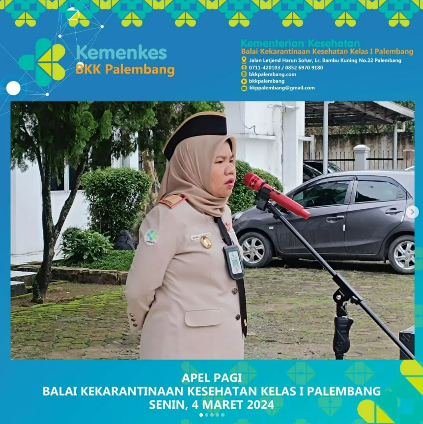 Selamat pagi Sobat Karkes, pada senin 4 Maret 2024, telah dilakukan kegiatan apel pagi yang bertempat di Lapangan Kantor Induk Balai Kekarantinaan Kesehatan Kelas 1 Palembang. Dalam Apel yang di pimpin langsung oleh Ibu Emmilya Rosa, SKM, MKM selaku kepala BKK Kelas 1 Palembang tersebut, disampaikan beberapa arahan antara lain :
