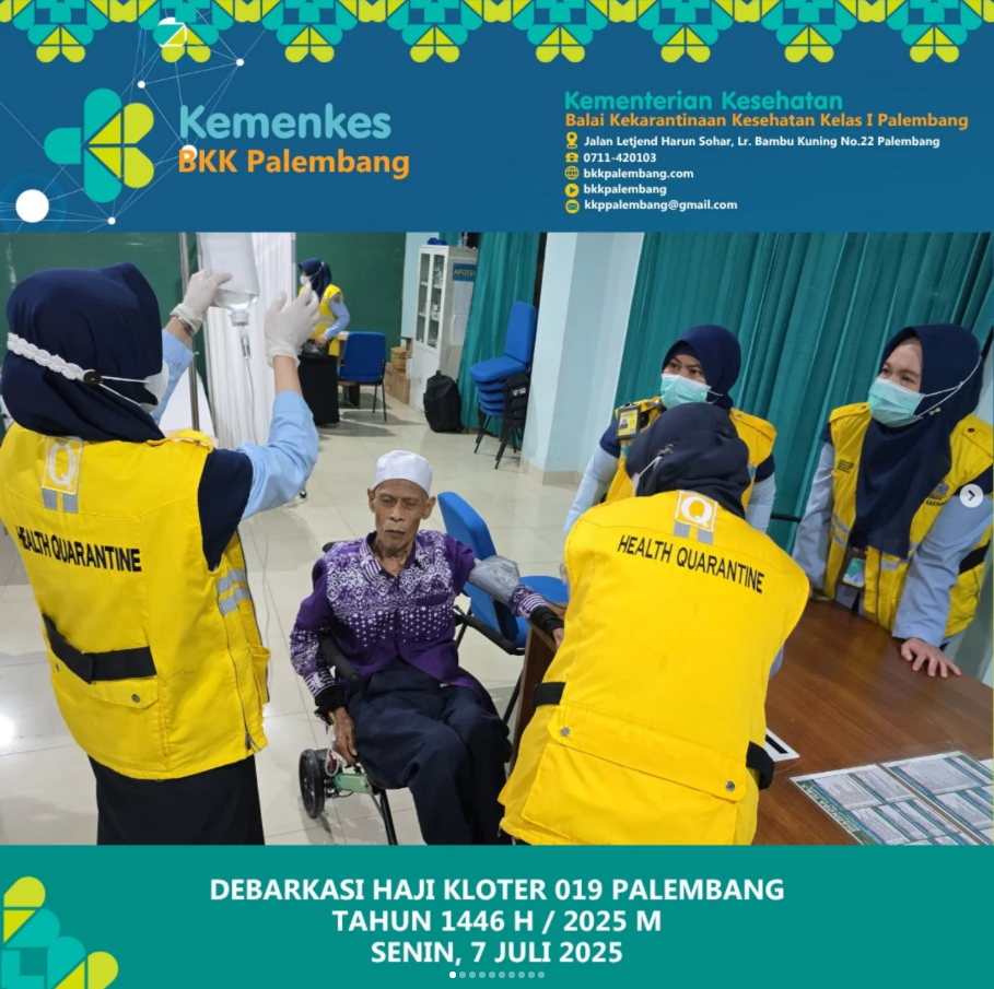 Petugas BKK Palembang melakukan tugasnya sebagai upaya cegah tangkal penyakit di pintu masuk negara. Sebelum jemaah turun dari pesawat, petugas BKK Palembang melakukan pemeriksaan GENDEC (General Declaration) untuk memastikan bahwa penerbangan dan penumpang memenuhi persyaratan yang berlaku. Selain itu juga di lakukan Edukasi Kesehatan kepada jemaah, pemeriksaan Sanitasi dan Vektor di Asrama Haji, serta melakukan Koordinasi dengan Instansi Terkait.