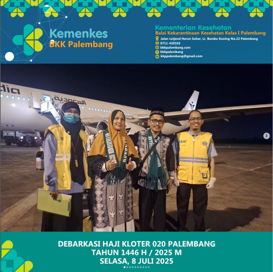 Kedatangan jemaah haji kloter 20 PLM Debarkasi Palembang, hari Selasa Tanggal 8 Juli 2025 pukul 04.17 WIB tiba dengan selamat di bumi Sriwijaya dengan senyum haru dan bahagia.