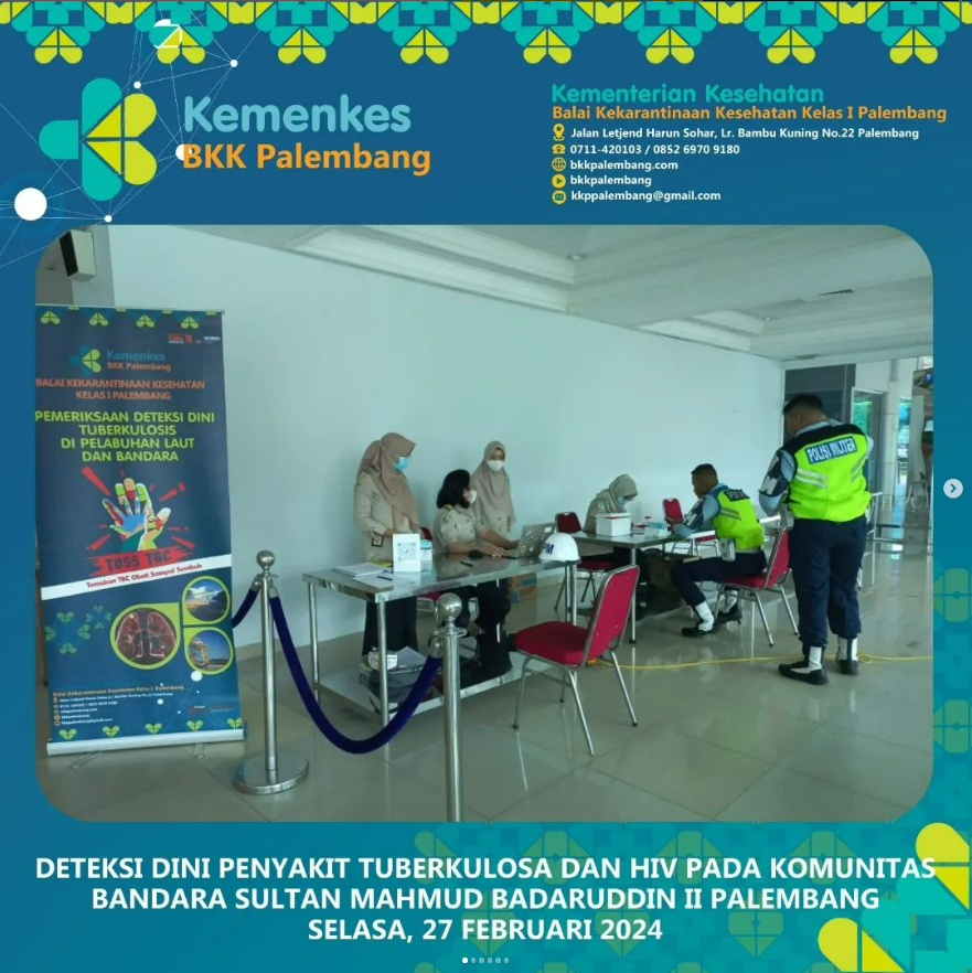 Balai Kekarantinaan Kesehatan Kelas I Palembang mempunyai tugas dan fungsi untuk mencegah masuk dan keluarnya faktor risiko dan penyakit di pintu masuk negara. Salah satu upayanya adalah dengan melakukan skrining atau deteksi dini penyakit Tuberkulosa dan HIV pada komunitas Bandara/Pelabuhan.