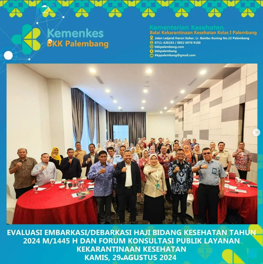 Balai Kekarantinaan Kesehatan Kelas I Palembang melakukan evaluasi penyelenggaraan Embarkasi - Debarkasi Haji Tahun 1445H-2024M pada hari Kamis, 29 Agustus 2024, di Hotel Harper.