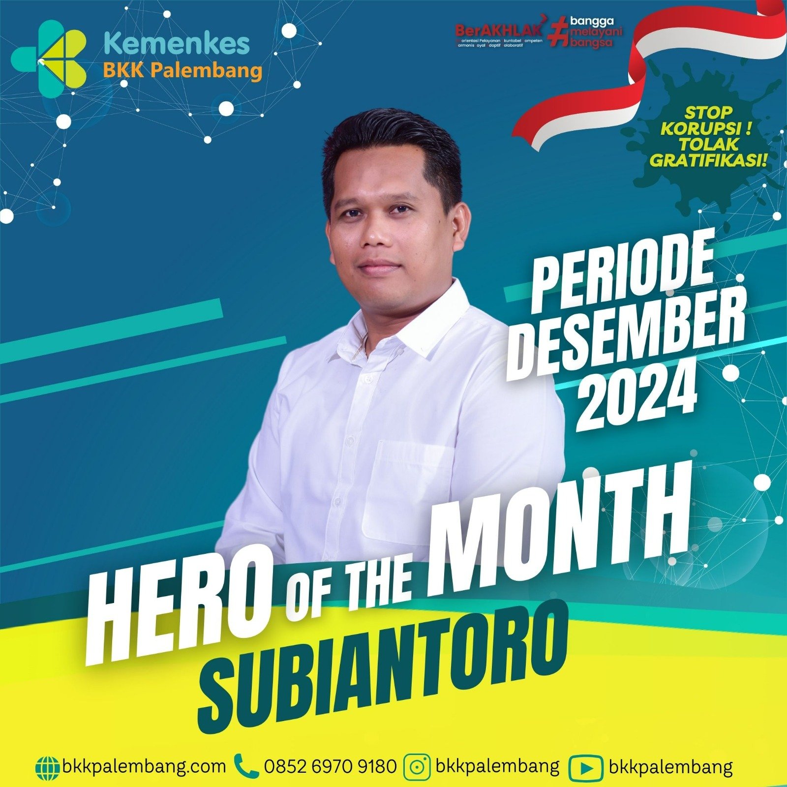 Balai Kekarantinaan Kesehatan Kelas I Palembang mengucapkan Selamat kepada Subiantoro, SKM atas terpilih menjadi Hero of The Month BKK Kelas I Palembang Periode Desember 2024 yang diberikan pada Apel awal tahun 2025 oleh Ibu Emmilya Rosa, SKM, MKM di kantor Induk BKK Kelas I Palembang.