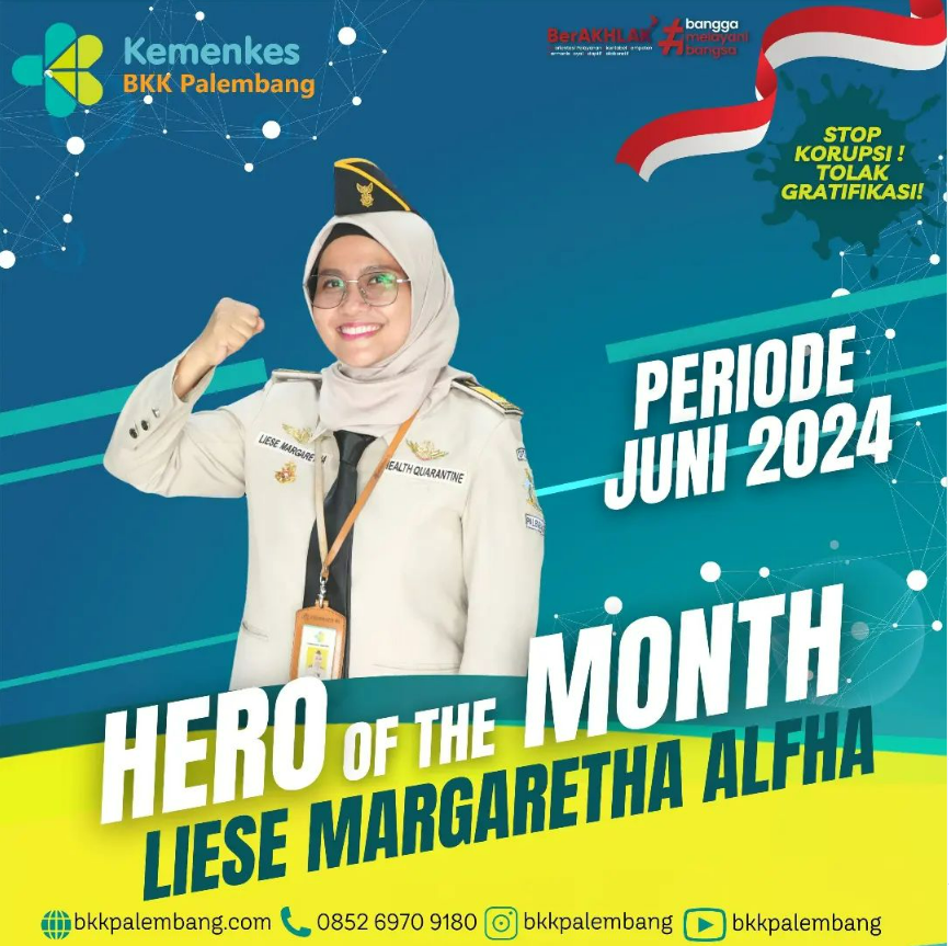 Balai Kekarantinaan Kesehatan Kelas I Palembang mengucapkan Selamat kepada dr. Liese Margaretha Alfha atas terpilih menjadi Hero of The Month BKK Kelas I Palembang periode Juni 2024.