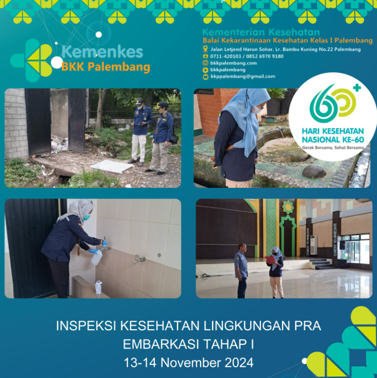 Tak terasa musim haji 2025 M/ 1446 H sudah di depan mata, BKK kelas I Palembang melalui Timker 3 Pengawasan Faktor Risiko Lingkungan melaksanakan inspeksi kesehatan lingkungan pra embarkasi tahap I pada Asrama Haji Palembang. Kegiatan bertujuan untuk mempersiapkan Asrama Haji agar memenuhi standar kesehatan lingkungan sehingga diharapkan dapat menjamin kesehatan dan keselamatan jamaah haji selama masa karantina. Lingkungan yang sehat dapat mengurangi risiko penularan penyakit sehingga jamaah haji dapat menjalankan ibadah dengan sehat dan nyaman.