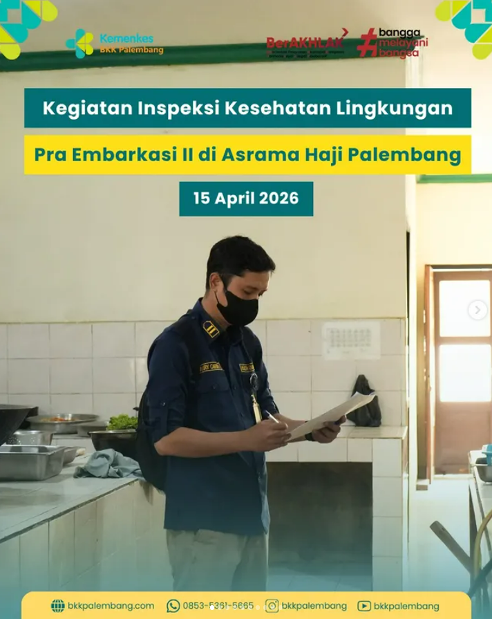 Rabu, 15 April 2026, BKK Kelas I Palembang melaksanakan kegiatan Inspeksi Kesehatan Lingkungan Pra Embarkasi II di Asrama Haji Palembang.