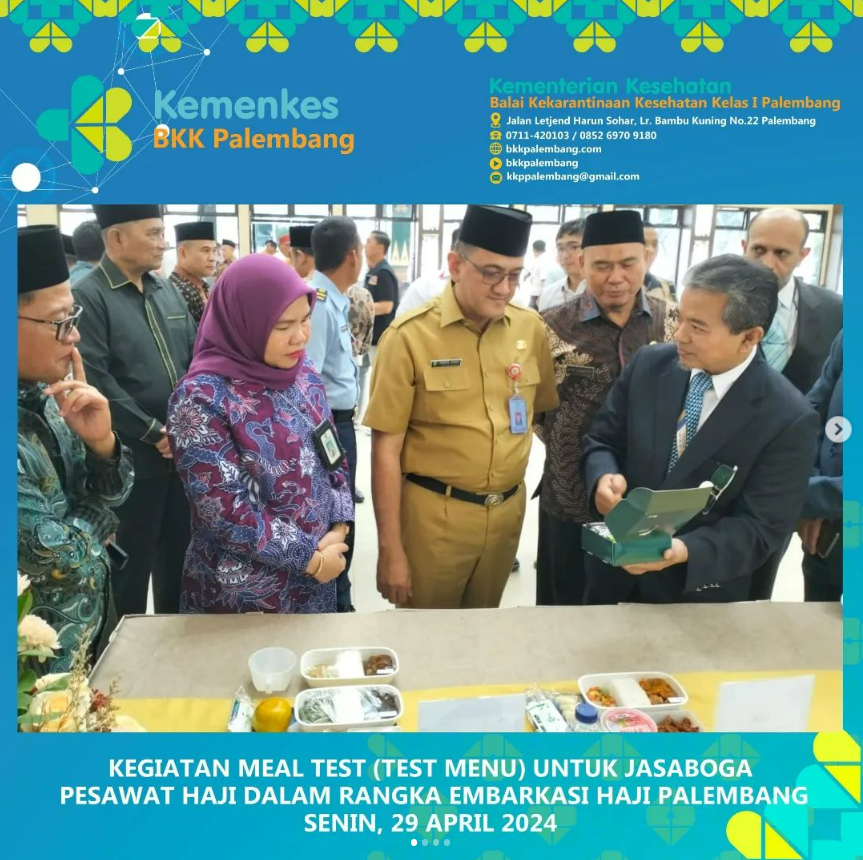 Di sela-sela kegiatan pelantikan anggota PPIH Embarkasi haji Palembang dilaksanakan uji kualitas makanan (meal test) yang akan disajikan untuk jamaah haji Indonesia selama dalam penerbangan menuju ke Tanah Suci dan pulang ke Tanah Air yang bertujuan untuk memastikan kualitas menu yang disajikan memenuhi standarisasi makanan seperti sisi kebersihan dan kesehatan serta memenuhi standard gizi.