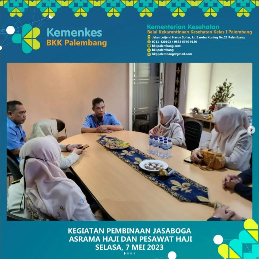 Kegiatan pembinaan jasaboga embarkasi Palembang dilakukan terhadap penyelenggara jasaboga asram haji dan jasaboga pesawat haji. Kegiatan pembinaan dilaksanakan oleh tim dari BKK kelas I Palembang meliputi kegiatan penyuluhan bagi penjamah makanan, pemeriksaan kesehatan penjamah makanan, inspeksi kesehatan lingkungan jasaboga yang diikuti dengan pengambilan dan pemeriksaan sampel lingkungan berupa sampel air bersih dan usap alat.