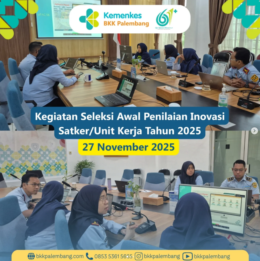 Kamis, 27 November 2025, BKK Kelas I Palembang mengikuti Kegiatan Seleksi Awal Penilaian Inovasi Satker/Unit Kerja Tahun 2025 yang dilakukan secara daring bersama tim penilai dari Ditjen Penanggulangan Penyakit.