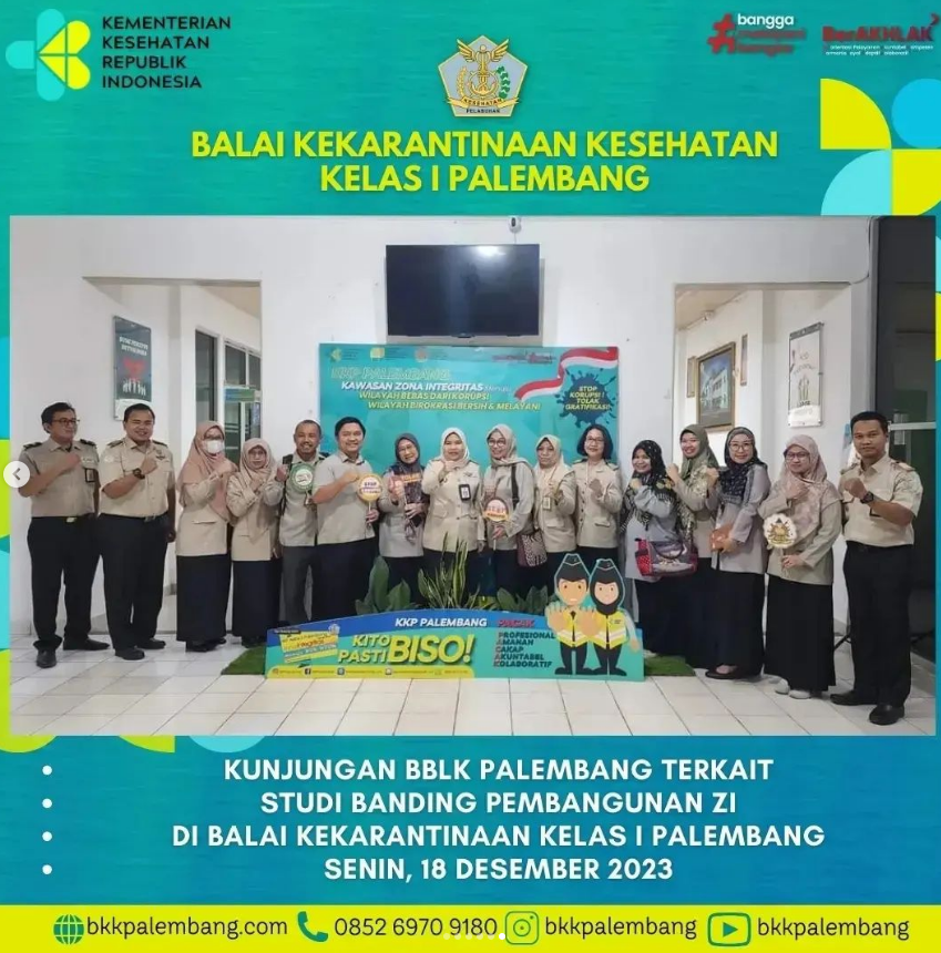 Pada hari Senin, 18 Desember 2023, Kepala Balai Kekarantinaan Kesehatan Kelas I Palembang Ibu Emmilya Rosa, SKM, MKM menerima kunjungan dari dr. Lisa Dewi, M. Kes selaku Koordinator Pelayanan sekaligus Ketua Tim ZI BBLK Palembang terkait Studi Banding Kaji Tiru atas Pembangunan ZI yang telah dilakukan oleh BKK Kelas I Palembang.