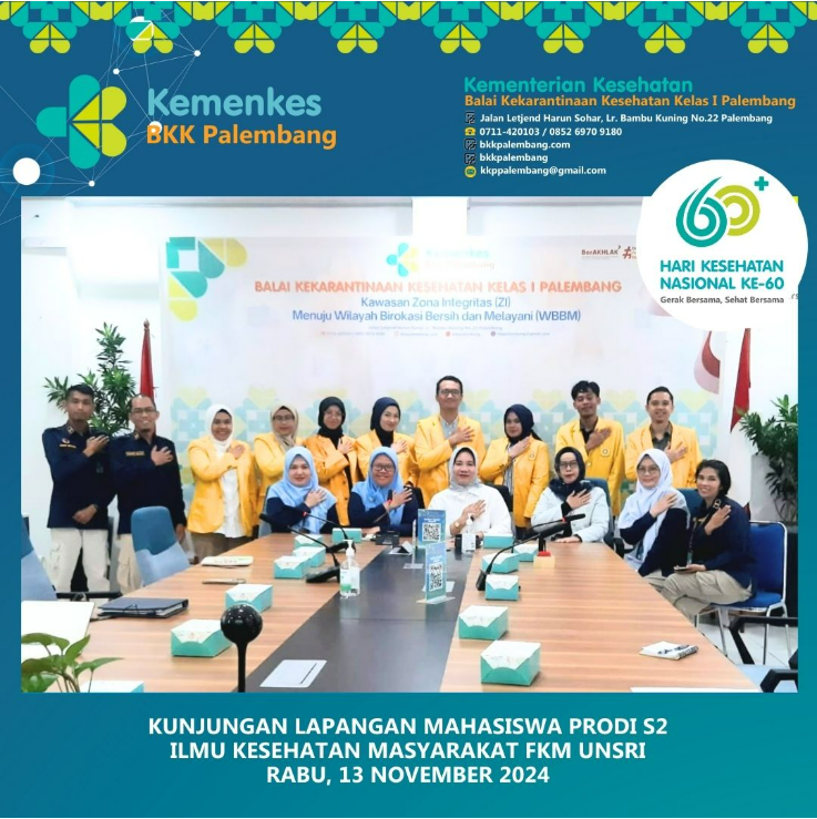 Rabu, 13 November 2024 BKK Kelas I Palembang mendapat kunjungan tamu istimewa yaitu dosen dan mahasiswa prodi S2 Ilmu Kesehatan Masyarakat Universitas Sriwijaya yang hendak melaksanakan kegiatan kunjungan lapangan. Adapun peserta berjumlah 12 orang yang terdiri dari 2 dosen pembimbing, 1 orang staf administrasi serta 8 orang mahasiswa. Kegiatan dilaksanakan dalam bentuk paparan dan diskusi tanya jawab di kantor BKK Kelas I Palembang serta kegiatan lapangan berupa kunjungan ke Asrama Haji Palembang guna mengikuti kegiatan inspeksi kesehatan lingkungan pra embarkasi tahap I.