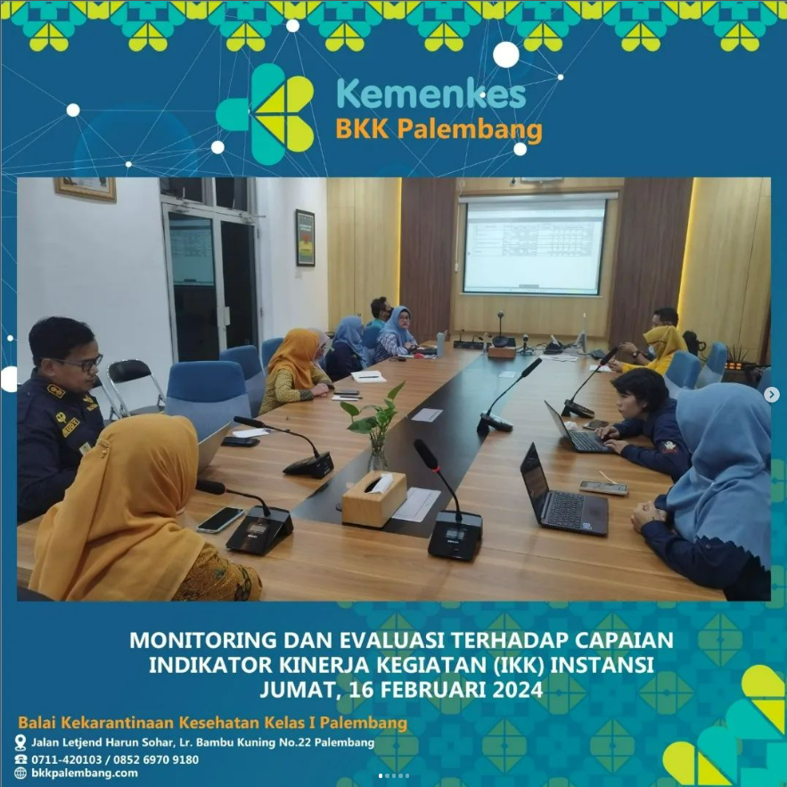 Pada hari Jumat, 16 Februari 2024, bertempat di Ruang Rapat BKK Kelas I Palembang, diadakan rapat Monev Kinerja Bulan Januari yang dipimpin oleh Ibu Kepala Balai, Emmilya Rosa, SKM, MKM.