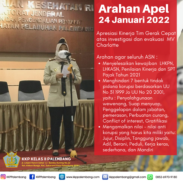 Pada Tanggal Senin 24 Januari 2022, KKP Kelas II Palembang mengadakan giat Apel Pagi secara serentak di Kantor Induk KKP Kelas II Palembang serta diikuti juga oleh setiap pegawai yang ada Wilayah Kerja. Dalam giat apel tersebut, Ibu Emmilya Rosa, SKM, MKM selaku Kepala KKP Kelas II Palembang memberikan apresiasi atas kinerja Tim Gerak Cepat atas investigasi dan evakuasi MV Charlotte, serta memberikan arahan agar seluruh ASN :