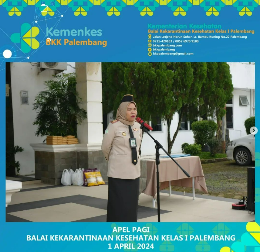 Pada hari Senin, 01 April 2024, telah dilaksanakan Apel Pagi yang diikuti oleh seluruh pegawai Balai Kekarantinaan Kesehatan Kelas I Palembang. Bertindak sebagai Pembina Apel, Ibu Kepala Balai memberikan arahan terkait pelaksanaan Posko Lebaran.