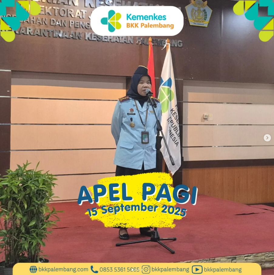 Pada hari Senin, 15 September 2025, telah dilaksanakan apel pagi rutin yang dipimpin oleh Kepala Balai Kekarantinaan Kesehatan (BKK) Kelas I Palembang, Ibu Emmilya Rosa, SKM, MKM.