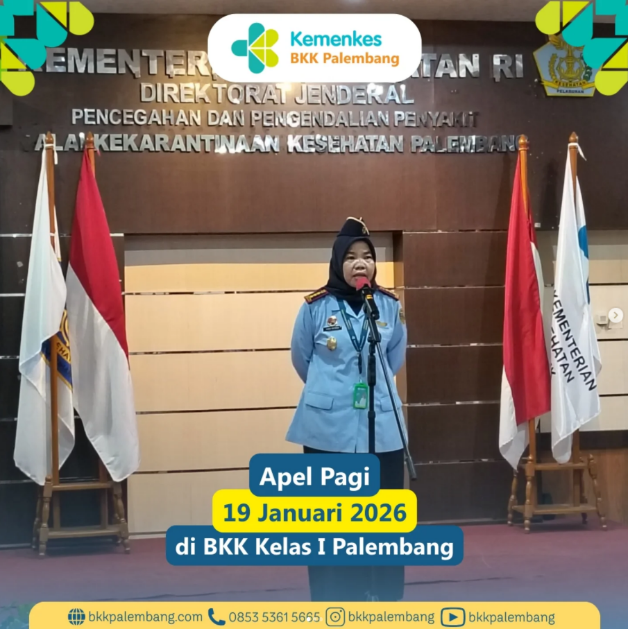Senin, 19 Januari 2026, BKK Kelas I Palembang melaksanakan apel pagi rutin yang dipimpin langsung oleh Kepala BKK Kelas I Palembang, Ibu Emmilya Rosa, SKM, MKM. Kegiatan apel pagi ini diikuti oleh seluruh pegawai ASN dan tenaga outsourcing.