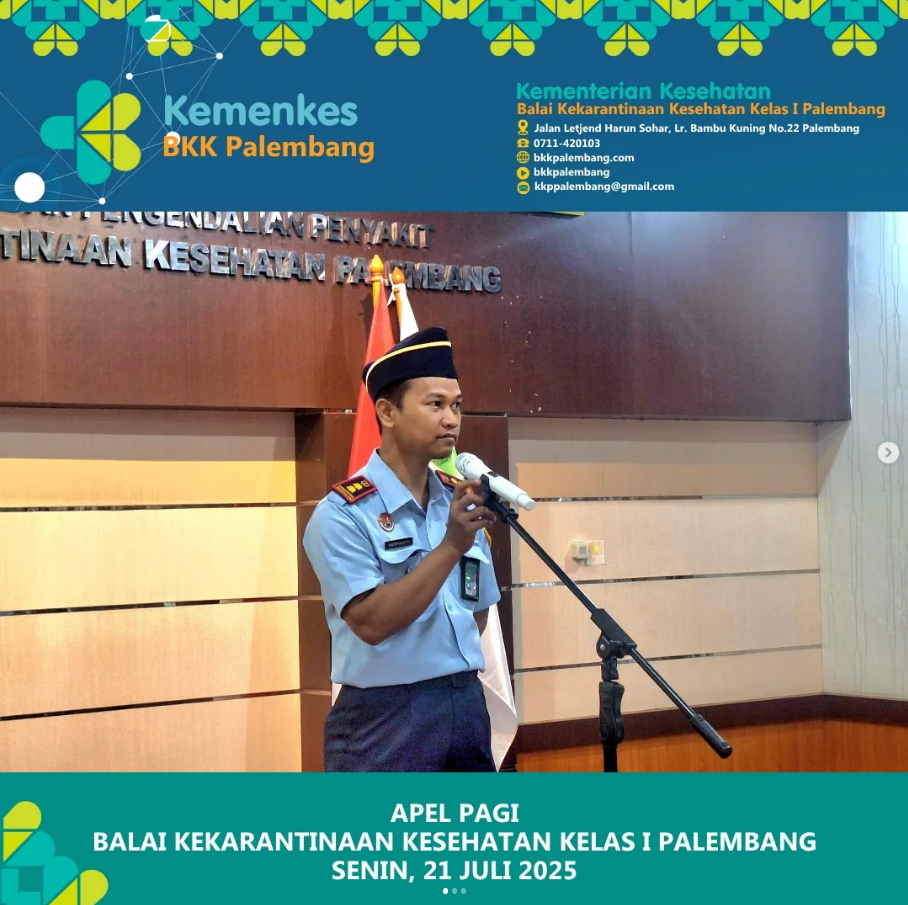 Pada hari ini, 21 Juli 2025, telah dilaksanakan apel pagi rutin yang dipimpin oleh Kepala Subbagian Administrasi Umum Balai Kekarantinaan Kesehatan (BKK) Kelas I Palembang, Bapak Heriyanto, ST, MKM.