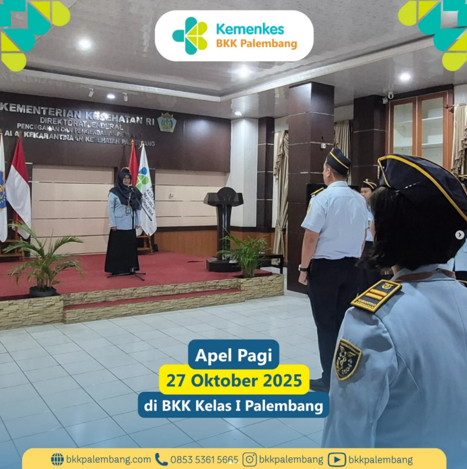 Senin, 27 Oktober 2025, BKK Kelas I Palembang melaksanakan apel pagi rutin di Aula BKK Palembang. Kegiatan ini dipimpin oleh Ketua Tim Kerja Pengawasan Faktor Risiko Kesehatan Alat Angkut dan Barang, Ibu Dwi Hastuti, SKM, serta diikuti oleh seluruh pegawai ASN dan tenaga outsourcing.