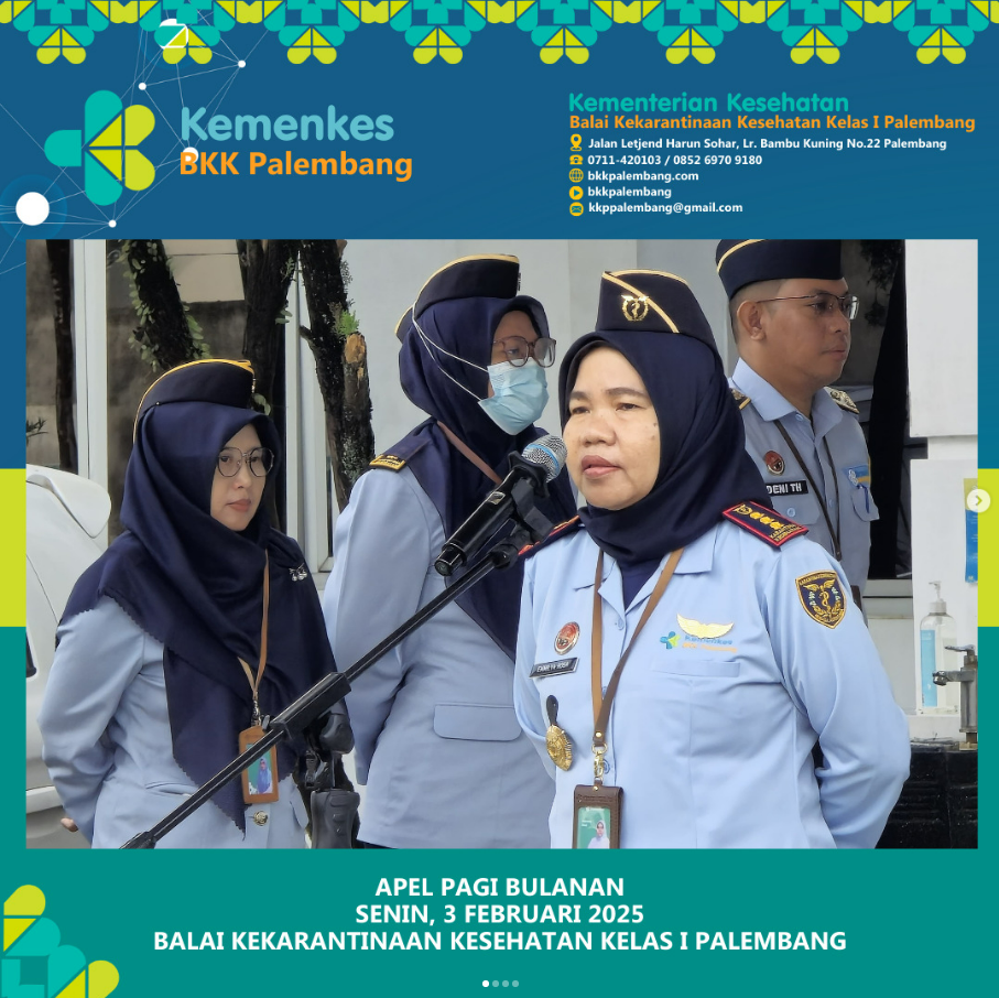 Pada hari ini, senin 3 Maret 2025, telah dilaksanakan apel pagi di Balai Kekarantinaan Kesehatan Kelas I Palembang. Apel pagi ini dipimpin langsung oleh Kepala Balai Kekarantinaan Kesehatan Kelas I Palembang Ibu Emmilya Rosa, SKM, MKM.